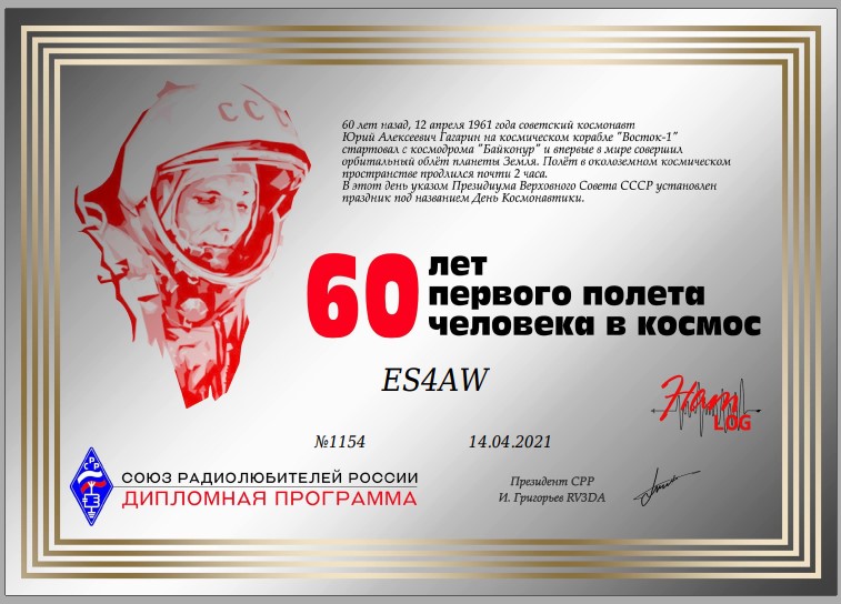 С 10 по 18 апреля 2021 года Союз Радиолюбителей России проводит Дни активности, посвященные 60-летию полета Юрия Алексеевича Гагарина в космос.